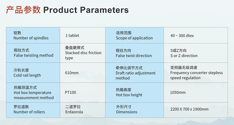DTY加彈實驗機的產(chǎn)品特點:該設備將滌綸(POY)、丙綸等無捻原絲,通過假捻變形加工成為具有中彈、低彈性能的彈力絲,同時可增加網(wǎng)絡部件進行網(wǎng)絡絲的加工。